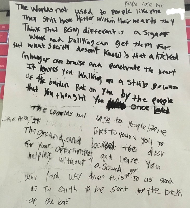 “The worlds not used to people like me. They still have Hitler within their hearts. They think that being different is a sign of weak and bullying can get them far. But what society doesn’t know is that a kicked in hanger can bruise and penetrate the heart.
